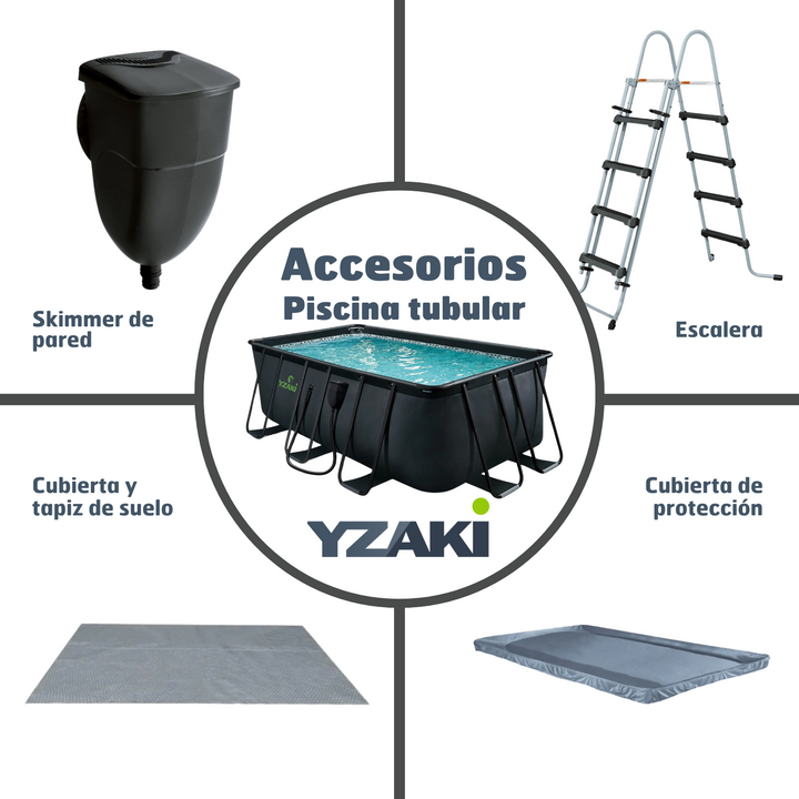 Como en todos los modelos de Yzaki, esta piscina incluye un skimmer de pared exclusivo, diseñado para recoger hojas e impurezas de la superficie del agua antes de que se hundan. Este sistema mejora la filtración, facilita el mantenimiento y reduce el uso de productos químicos, asegurando agua más limpia y cristalina con menos esfuerzo.